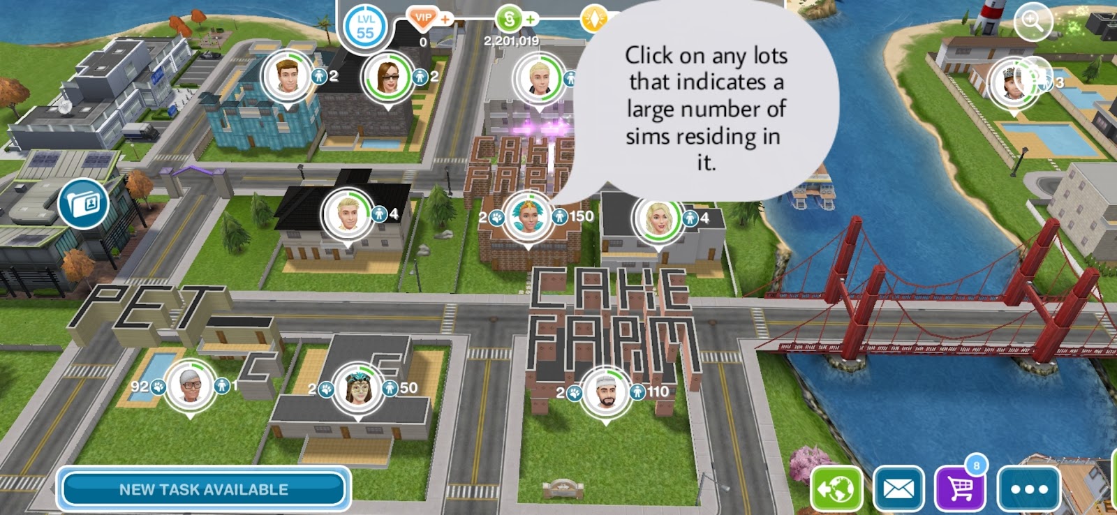 NOTE : To find the lots with the cake farm, look for any lot that indicates a large number of sims occupying it. Just like this.